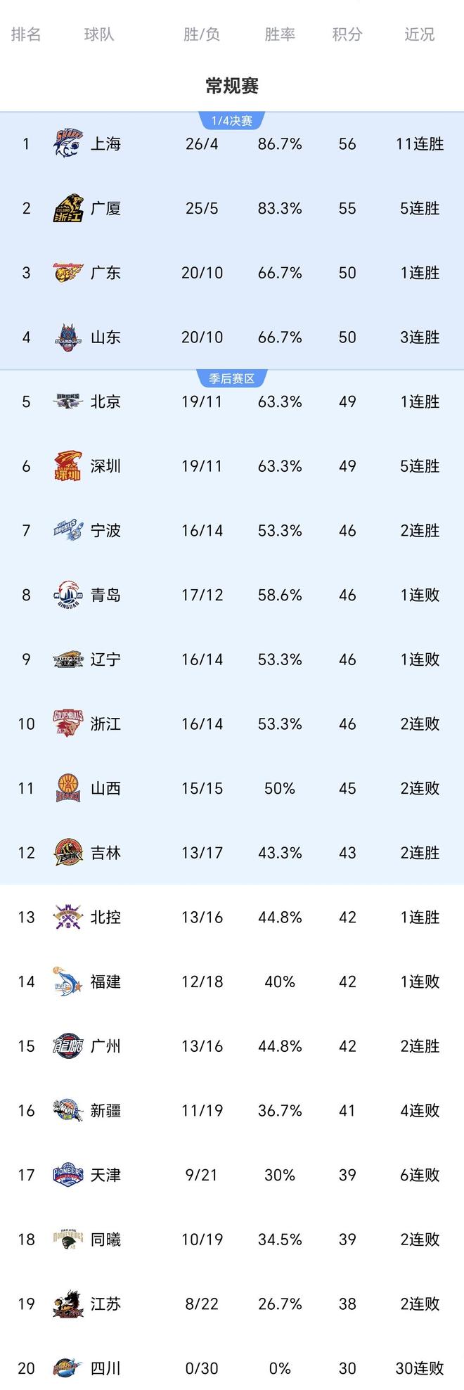CBA积分榜一夜大变:上海11连胜,辽宁遭爆冷,广东送四川30连败