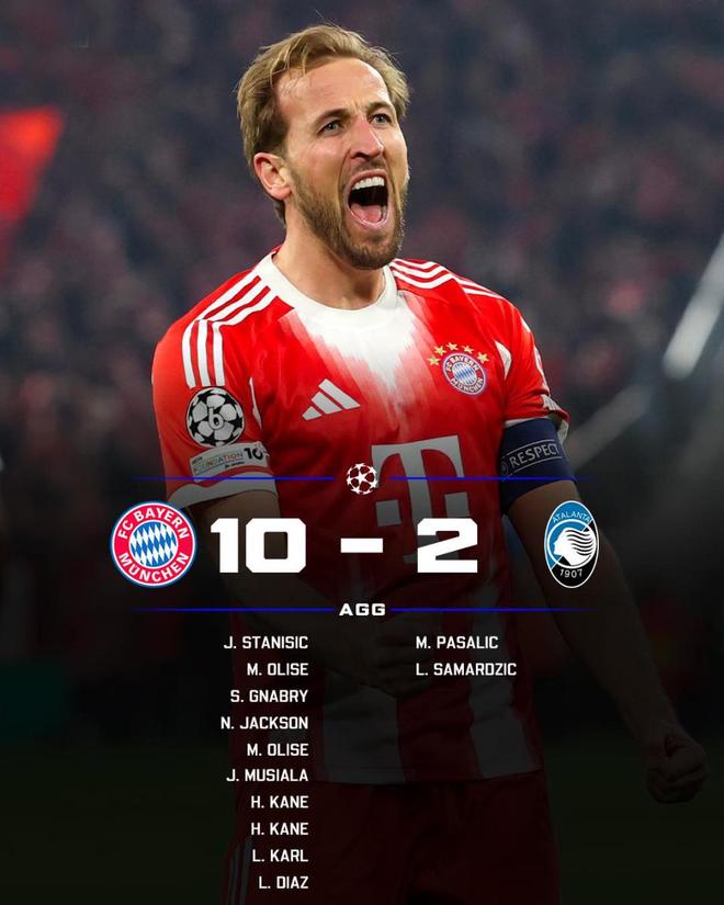 随后路易斯-迪亚斯助攻伦纳特-卡尔再下一城,紧接着路易斯-迪亚斯获得单刀挑射锦上添花,拜仁4-0遥遥领先,最后时刻,亚特兰大由萨尔马季奇扳回颜面1球。最终,拜仁4-1大胜对手,总比分10-2横扫亚特兰大,强势晋级8强,他们的对手正是皇马。
