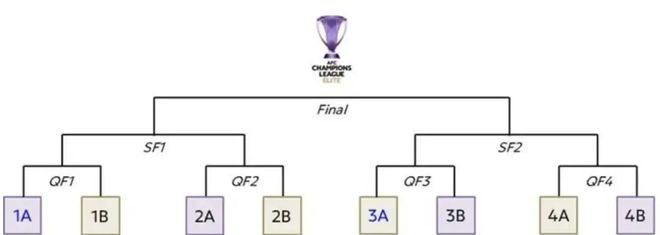 每支球队将被抽入决赛淘汰赛的八个位置之一(1A-4A和1B-4B),确保形成四组跨区域对阵。